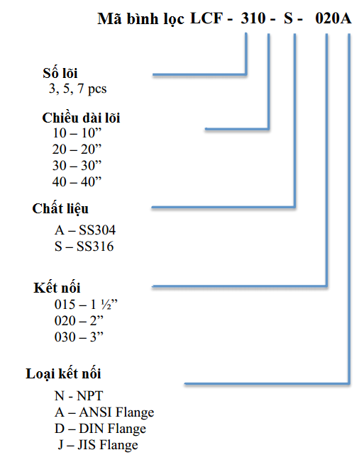- Thiết kế có sẵn trong 3, 5 và 7 lõi trong chất liệu SS304 và SS316, có thể cung cấp cho tất cả các loại lõi lọc tiêu chuẩn DOE công nghiệp và doanh nghiệp nhà nước cấu hình chiều dài lõi lọc lên đến 40 ".